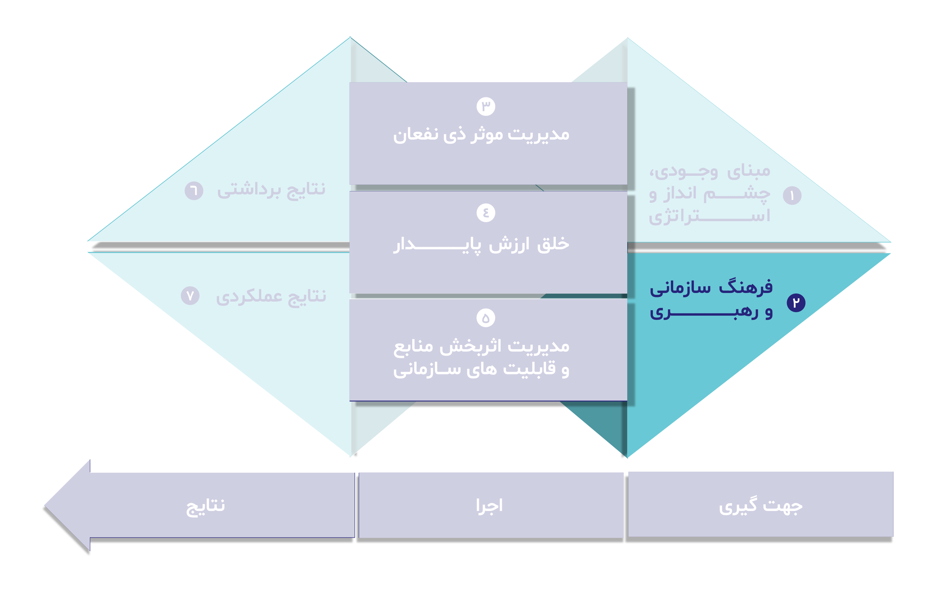 هر فردی که در سازمان وظیفه برنامهریزی هدایت و کنترل فرد یا افرادی را بر عهده دارد، رهبر محسوب میگردد. در این مدل رهبری فراتر از نقش به عنوان یک رفتار باید در سازمان نهادینه گردد. یک رهبر ضمن برخورداری از نگاهی آینده نگارانه، باید زمینه پیشبرد اهداف راهبردی و تحقق نیازها و انتظارات کلیه ذینفعان را فراهم نماید. رهبر باید فرهنگ سازمانی را به گونهای طراحی نماید که در سراسر اکوسیستم، رفتارهای مطلوب کلیه سطوح کارکنان به عنوان الگو شناخته شود.